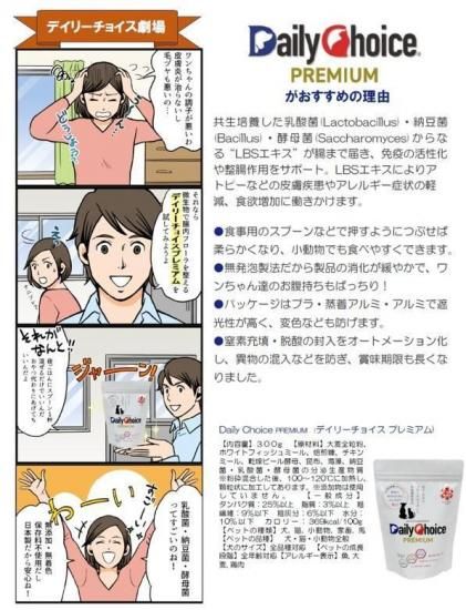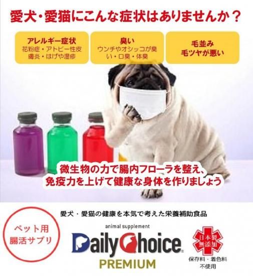 デイリーチョイス プレミアムは腸内環境を整えるため、健康な体作りをサポートします。乳酸菌・納豆菌・酵母菌のパワーにより、免疫力がアップし、健康な毎日を送ることができます。老犬や病気のリカバリー中の犬にもおすすめです。
